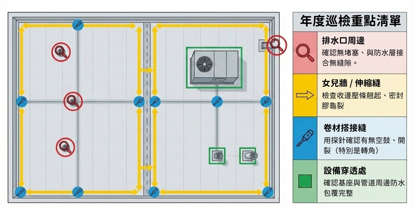 | PVC防水膜 | 15-20年以上 | 塑化劑揮發、紫外線老化 | 每年檢查接縫與收邊,避免尖銳物刺穿 |