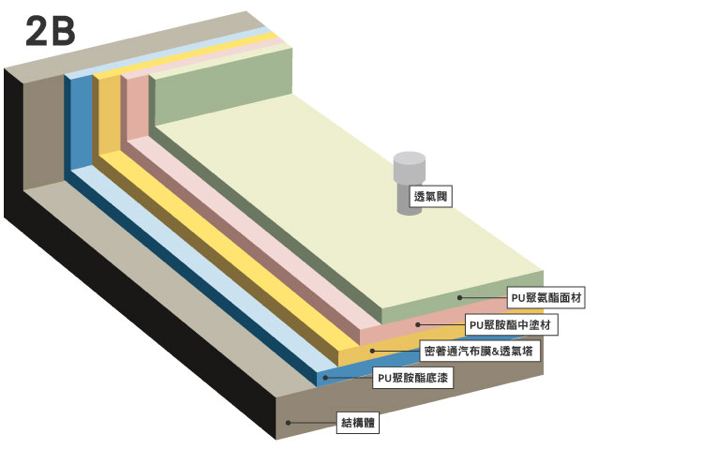 ▲塗膜防水密著透氣系列-複合式工法(使用PU聚胺脂施工)
