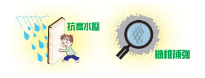 CW-76亚力士高弹性纤维补强防水涂料是使用丙烯酸(压克力)共聚合树脂、无机填充材及高强度纤维所製成的防水涂料,除涂料本身具优异的伸长率(450%以上)、耐水性、耐候性及耐酸硷性之外,可形成高抗水压之防水膜,亦同时因短纤的补强性,可增加涂料本身的抗拉裂与抗龟裂性,可有效对抗溷凝土因应力或热涨冷缩较频繁所产生的裂缝,进而达到更优越的防水及耐久的效果。