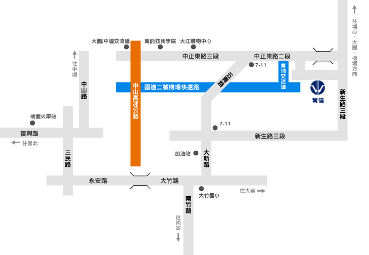国道1号接国道2号机场快速道路,往机场方向,下青埔交流道后右转中正东路 二段 (往大园方向),于二段151号右转进入。